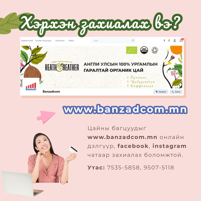 Цайны багцуудыг www.banzadcom.mn онлайн дэлгүүр, facebook, instagram чатаар захиалах боломжтой. Утас: 7535-5858, 9507-5118