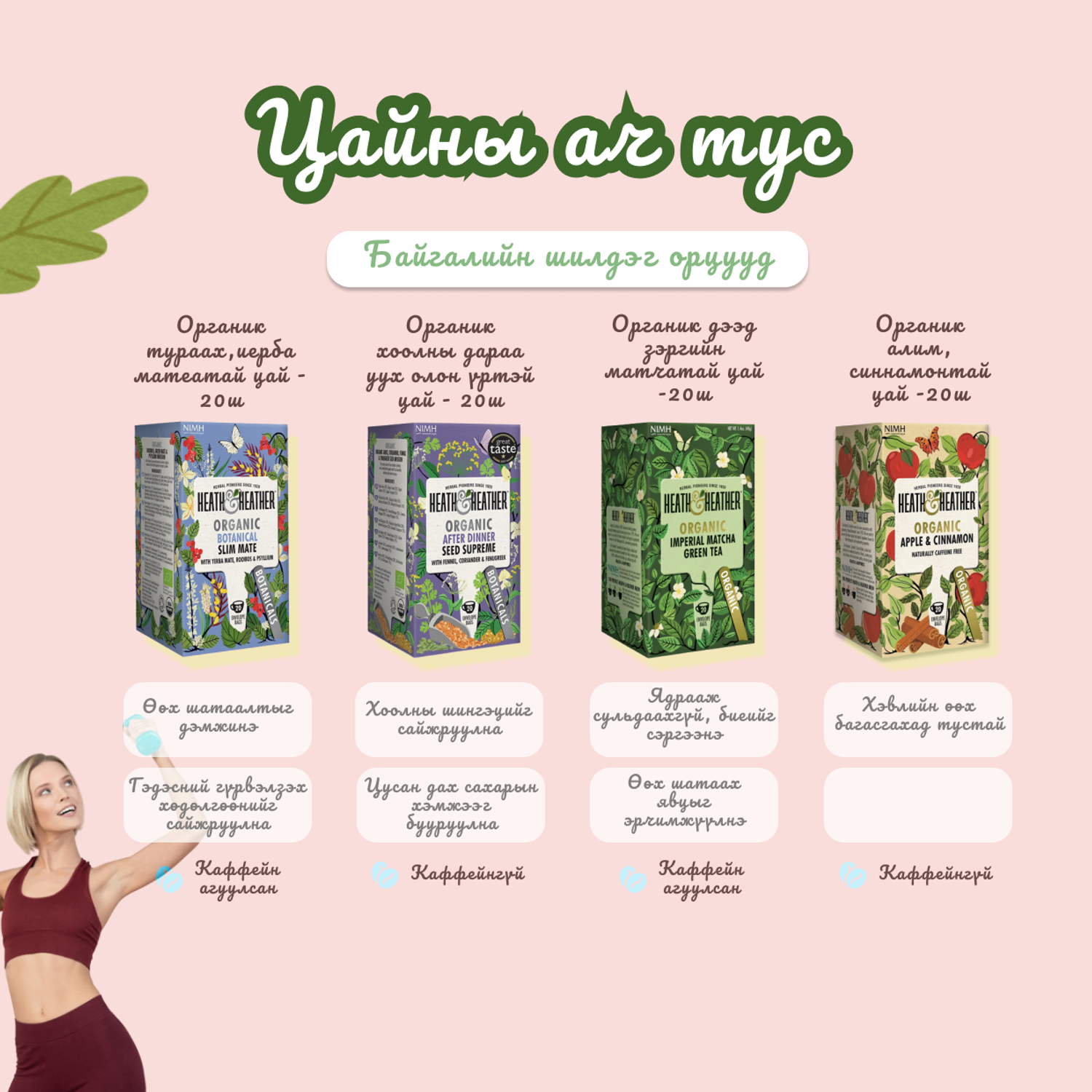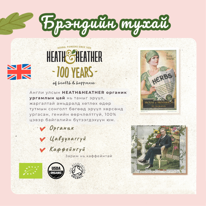 Англи улсын HEATH&HEATHER органик ургамлын цай нь таныг эрүүл, жаргалтай амьдралд хөтлөх өдөр тутмын сонголт бөгөөд эрүүл хөрсөнд ургасан, генийн өөрчлөлтгүй, 100% цэвэр байгалийн бүтээгдэхүүн юм.