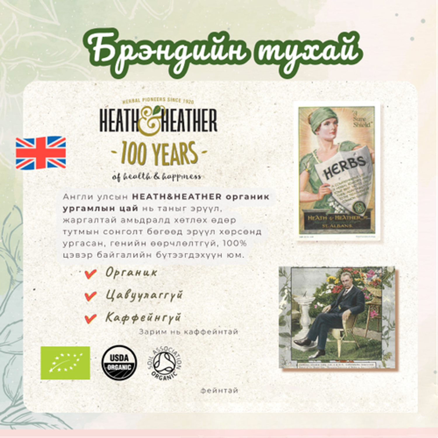 Англи улсын HEATH&HEATHER органик ургамлын цай нь таныг эрүүл, жаргалтай амьдралд хөтлөх өдөр тутмын сонголт бөгөөд эрүүл хөрсөнд ургасан, генийн өөрчлөлтгүй, 100% цэвэр байгалийн бүтээгдэхүүн юм.