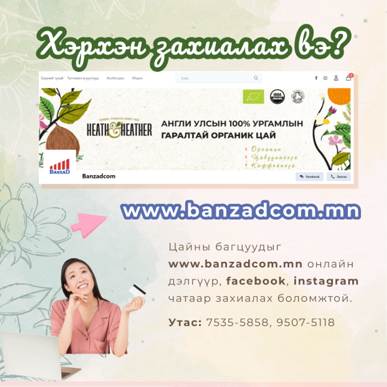 Цайны багцуудыг www.banzadcom.mn онлайн дэлгүүр, facebook, instagram чатаар захиалах боломжтой. Утас: 7535-5858, 9507-5118